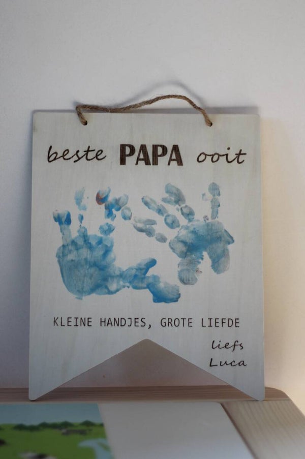 Op zoek naar een persoonlijk en ontroerend Vaderdagcadeau? Dit houten vlaggetje (± 20 x 25 cm) is hét perfecte cadeau voor de allerliefste papa. Bovenaan staat het opschrift Beste papa ooit en onderaan Kleine handjes, grote liefde met plaats voor de namen van de kindjes.