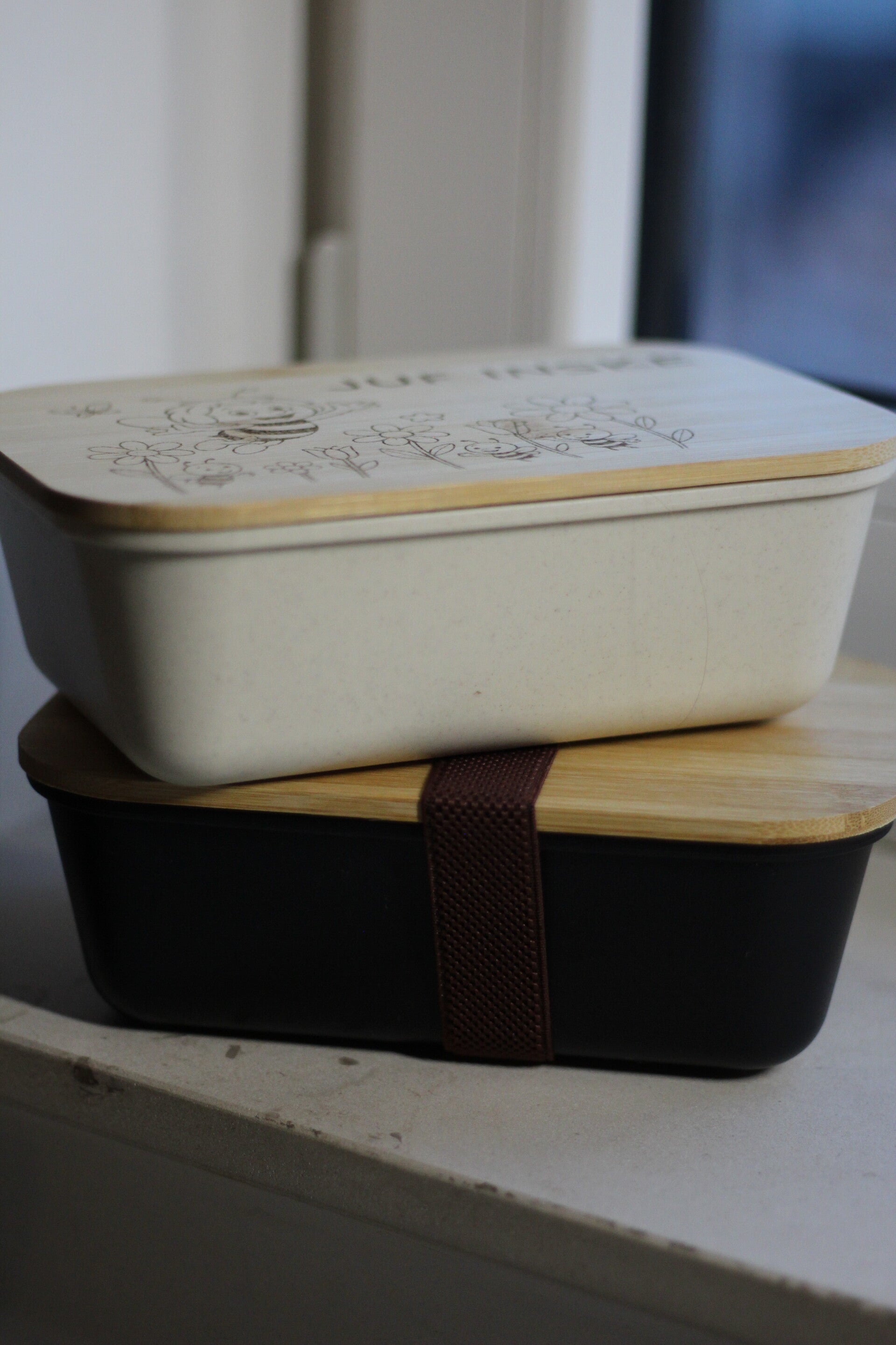 Deze degelijke lunchbox is verkrijgbaar in wit of zwart, met een bamboe deksel die gegraveerd wordt met een tekst en/of tekening naar keuze denk aan een naam, korte boodschap of leuke quote.