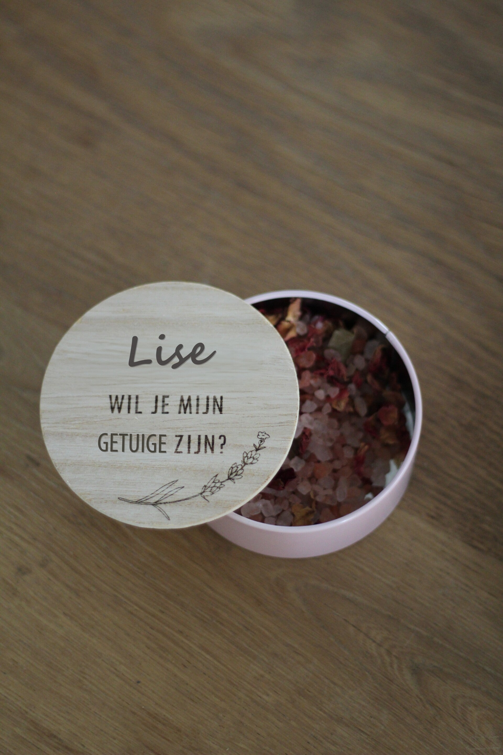 Blikken doosje gevuld met badzout, gepersonaliseerd met de vraag: ..., wil jij mijn getuige zijn?