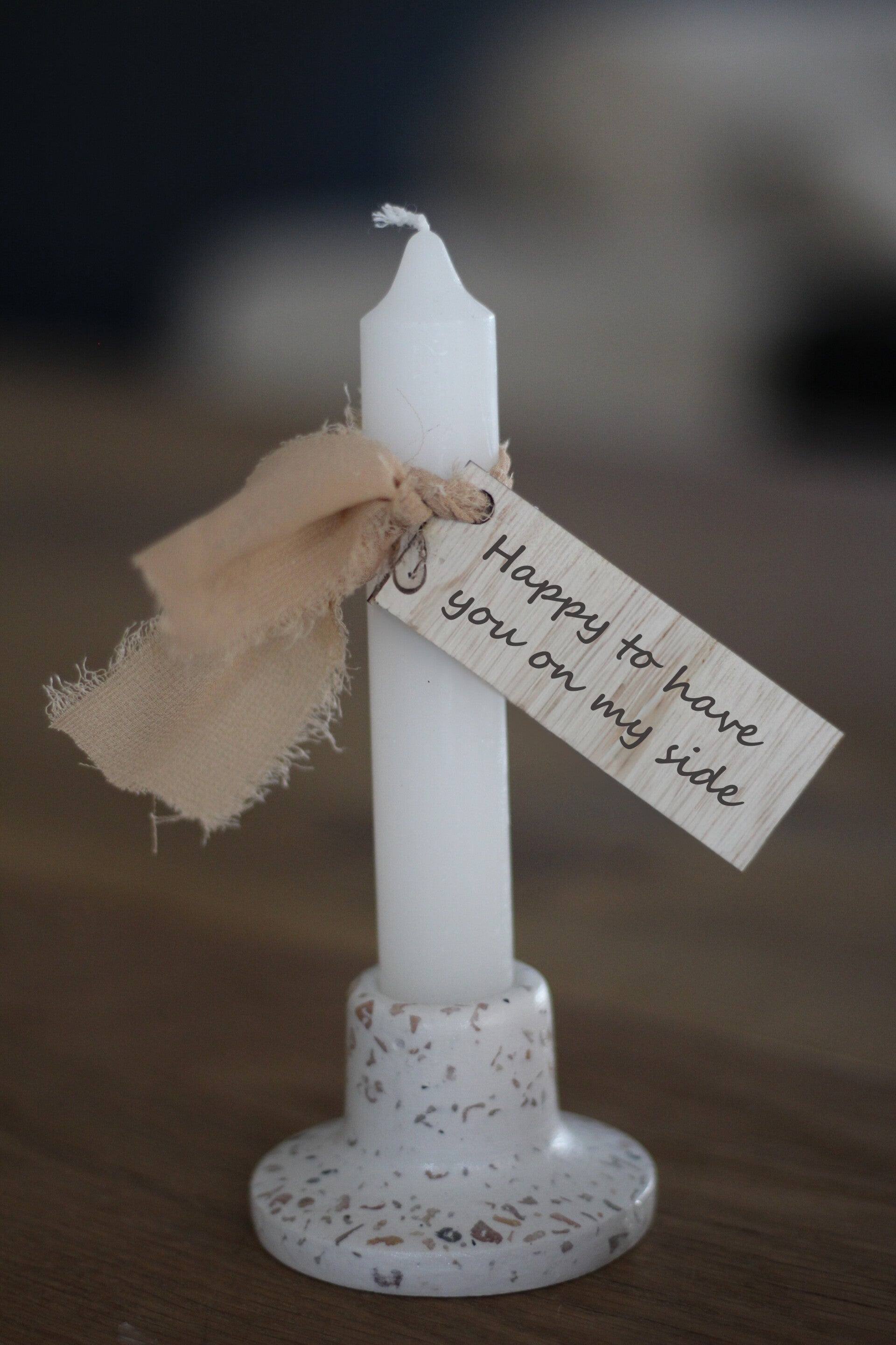 Welk kort tekstje wil je toevoegen op het houten labeltje rond de kaars? (bijvoorbeeld happy to have you on my side)