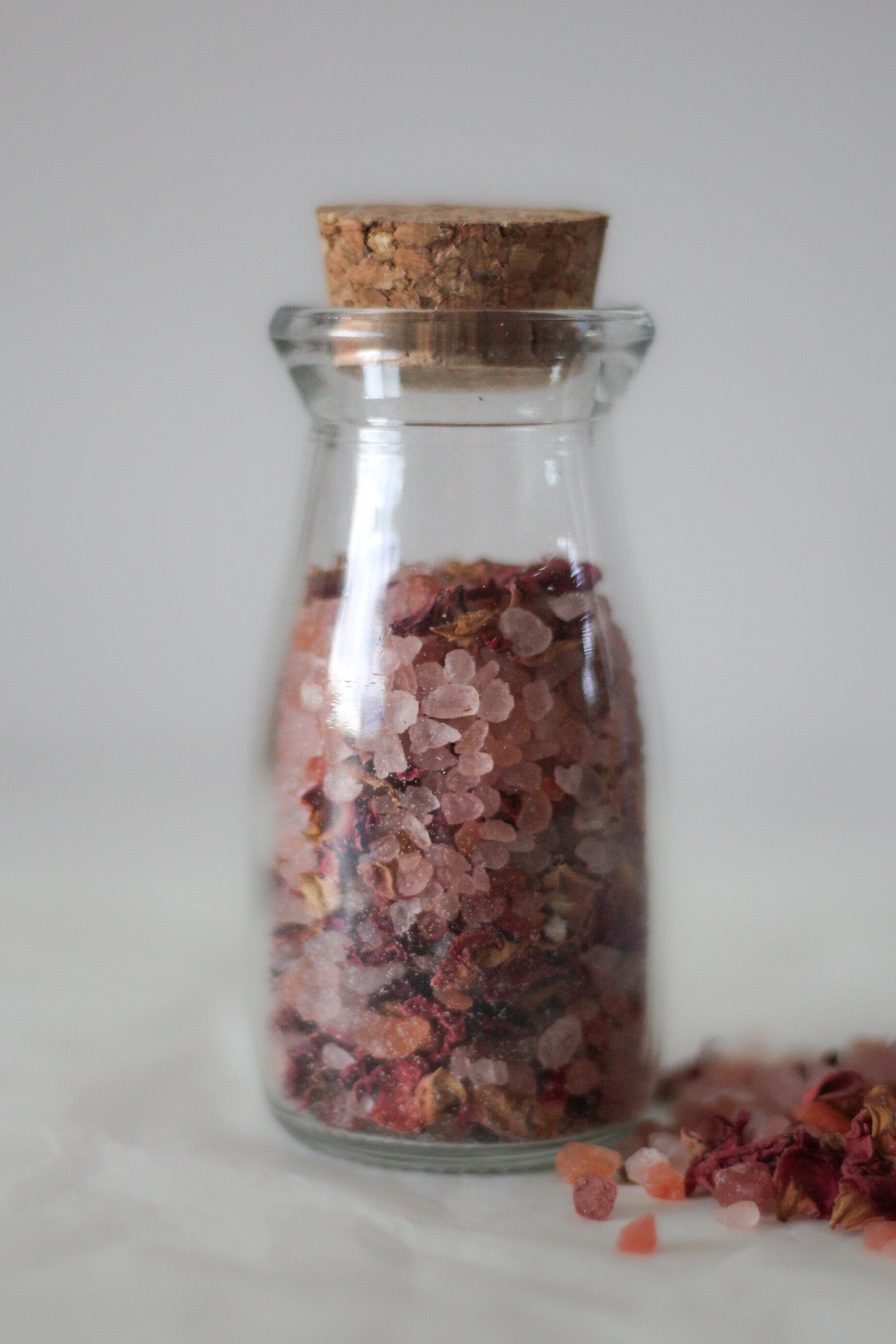 Vul je proefbuisjes, cilindertjes met kurkstop of de flesjes met kurkstop op met dit grof Himalayabadzout met rozenblaadjes.