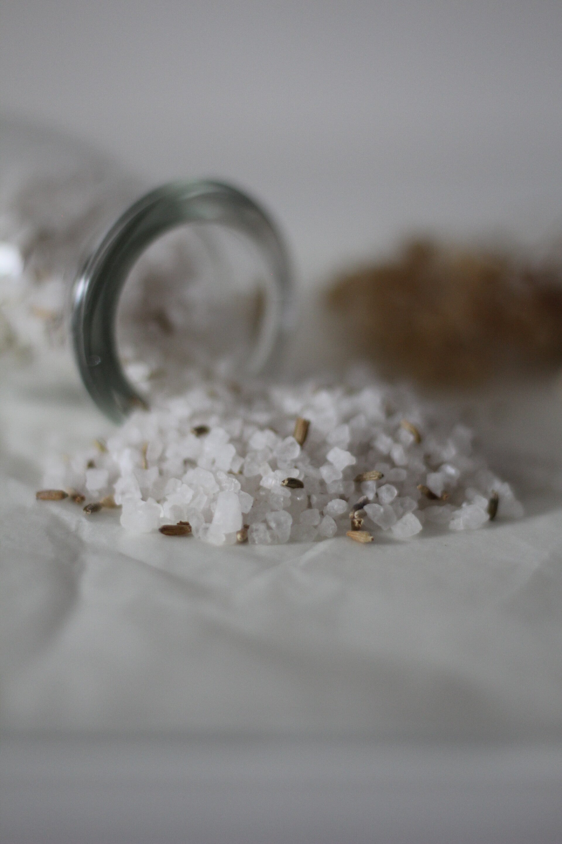 Vul je proefbuisjes, cilindertjes met kurkstop of de flesjes met kurkstop op met dit grof badzout met lavendel en rozemarijn.
