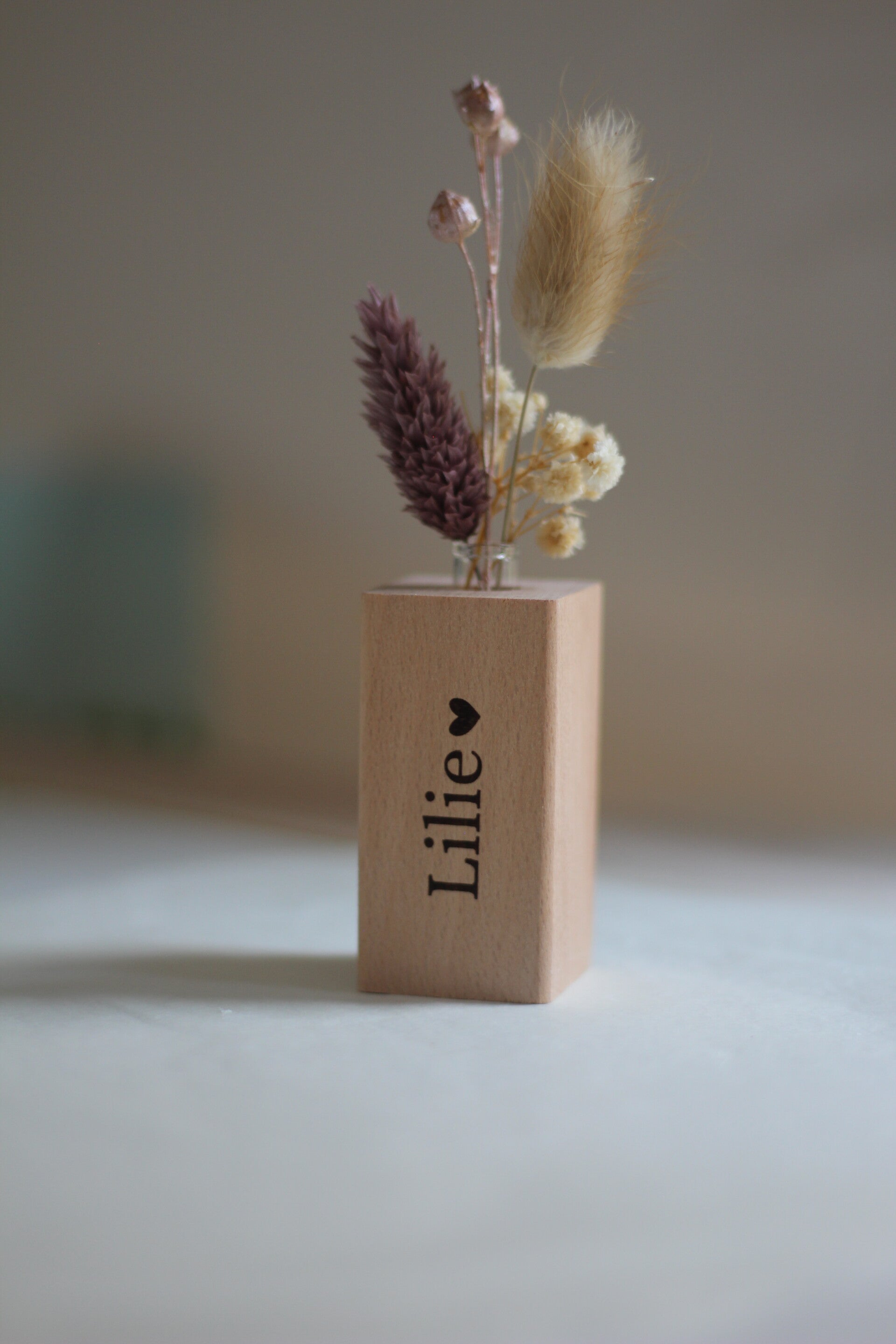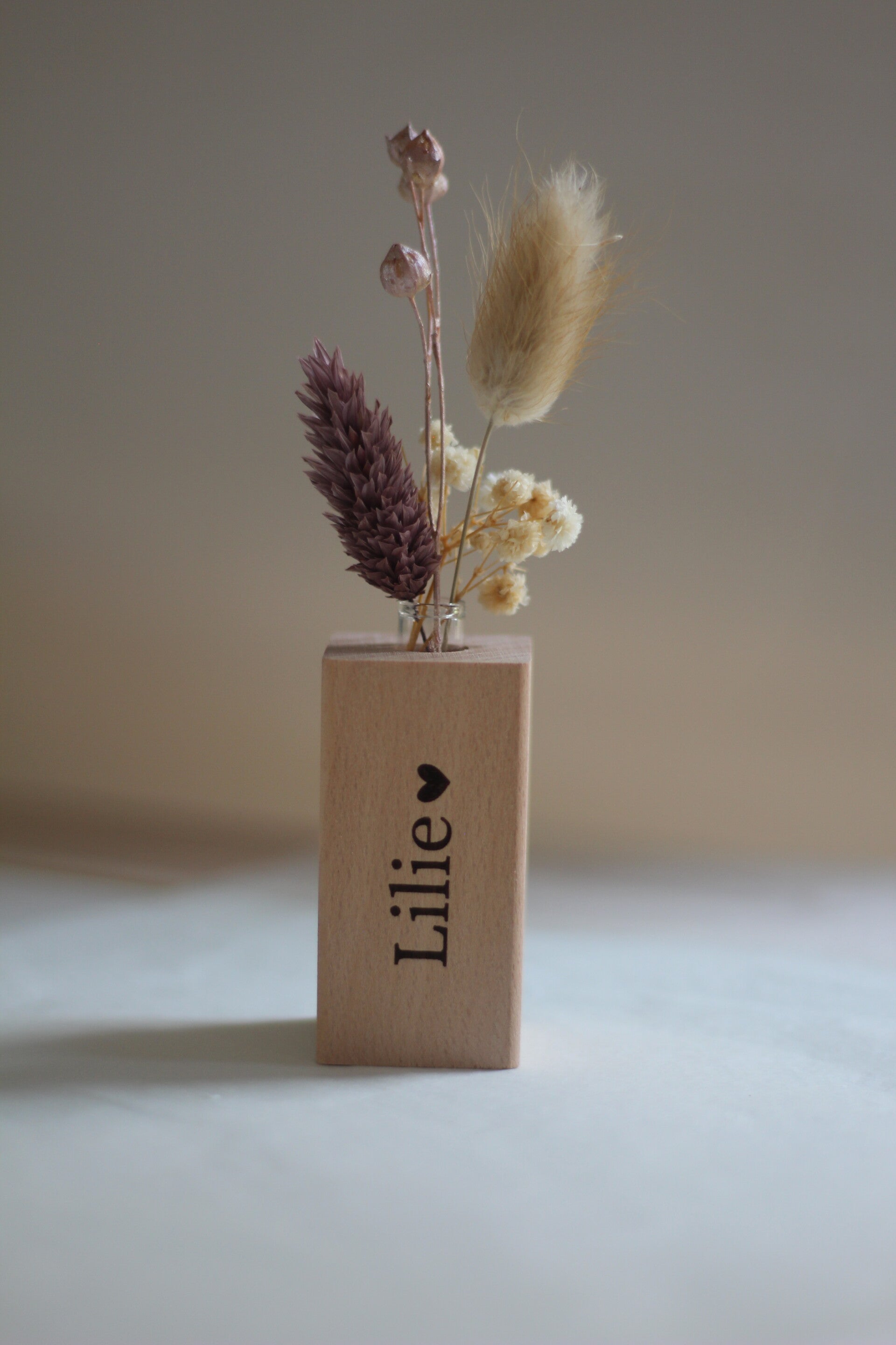 Dit gegraveerd houten vaasje is perfect als uitdeelcadeautje in combinatie met een klein boeketje droogbloemetjes.