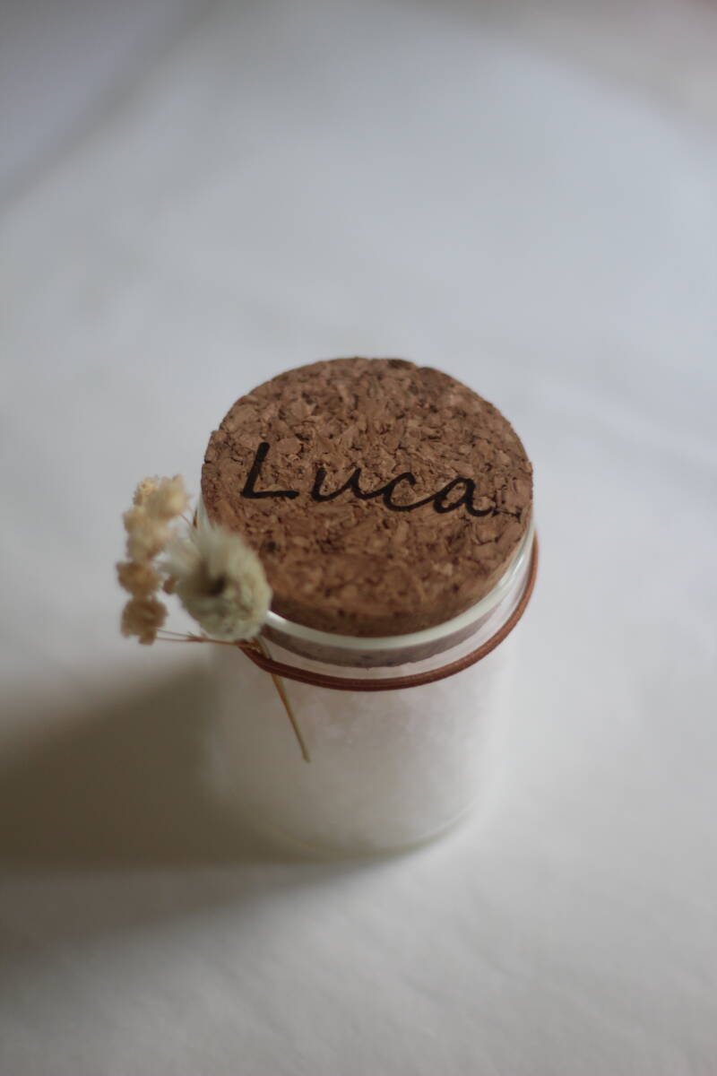 Een potje met kurken deksel is perfect om te vullen en te personaliseren en als uitdeelcadeautje mee te geven.
