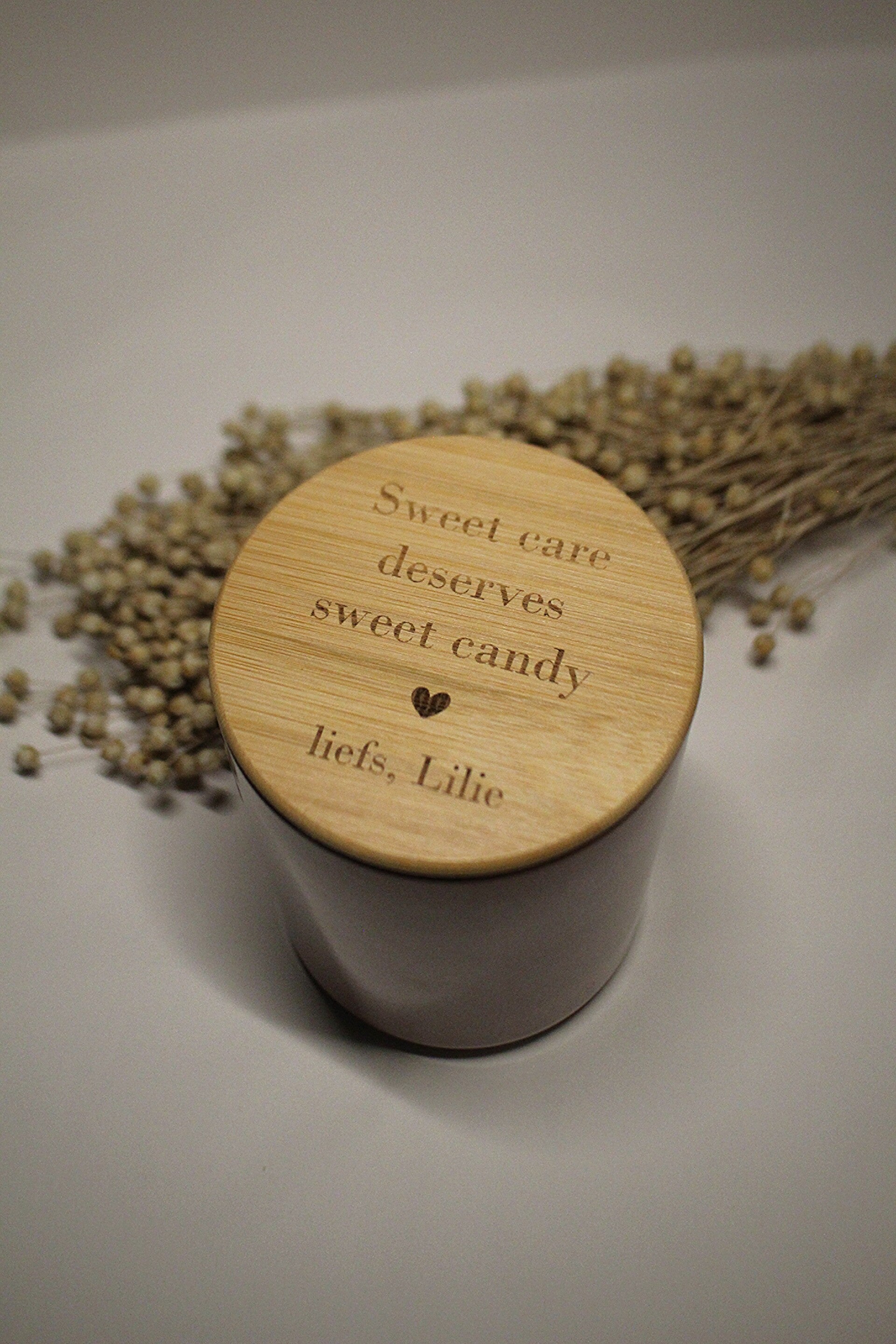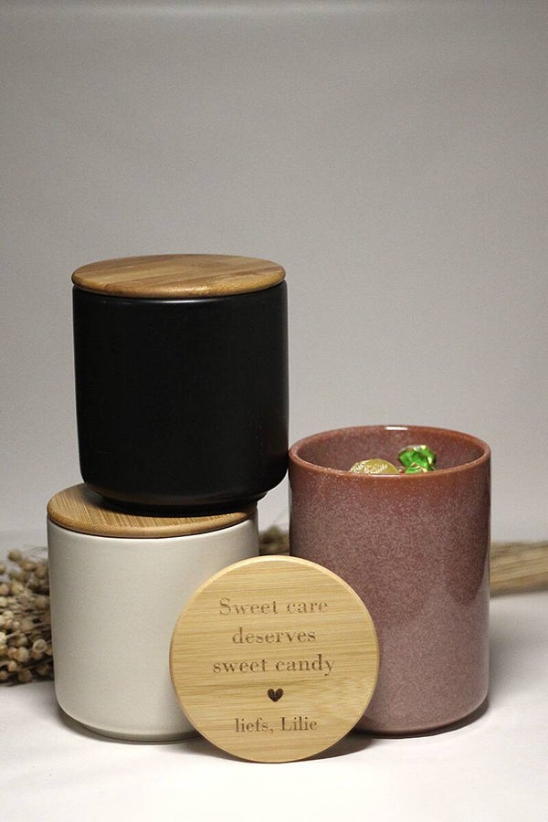 Vereeuwig je mooiste herinnering gegraveerd op het deksel van een mooi afgewerkte voorraadpot, beschikbaar in 3 kleuren: zwart, crème en een prachtige roze tint. Vul hem achteraf zelf naar believen met lekkers. Het aanbod van lettertypes vind je terug bij de afbeeldingen.