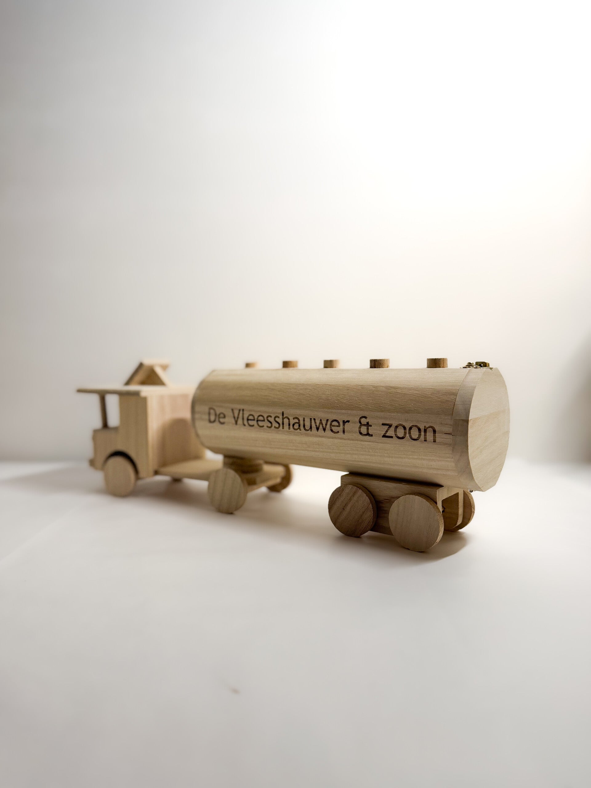 Deze houten tankwagen is een uniek en speels cadeau, ideaal voor een geboorte, doop of andere speciale gelegenheid. De tank zelf van de wagen kan open en heeft een lengte van 26 cm met een diameter van ongeveer 8 cm.