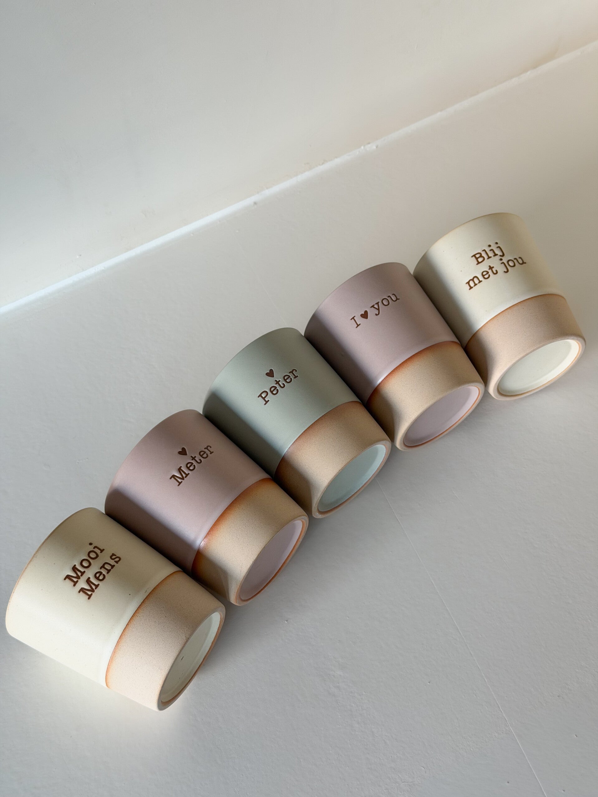 - een keramieken koffiemok: keuze uit verschillende kleuren en opschriften