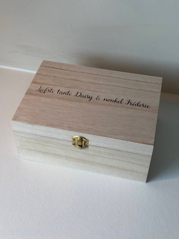 In het houten kistje (personaliseerbaar met boodschap naar keuze) vind je: