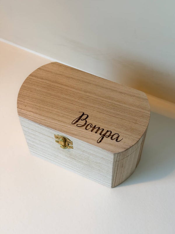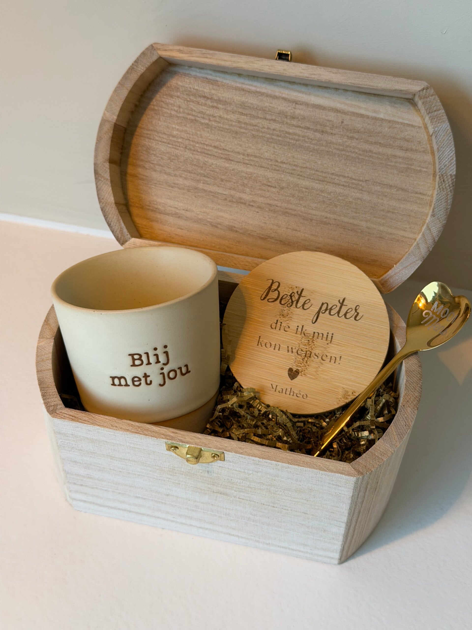Dit houten kistje is gevuld met persoonlijke mok, gouden lepel en gepersonaliseerd onderzetbordje met een warme én een persoonlijke boodschap die recht uit het hart komt. Een subtiel, liefdevol en blijvend aandenken dat jullie bijzondere band extra in de verf zet.