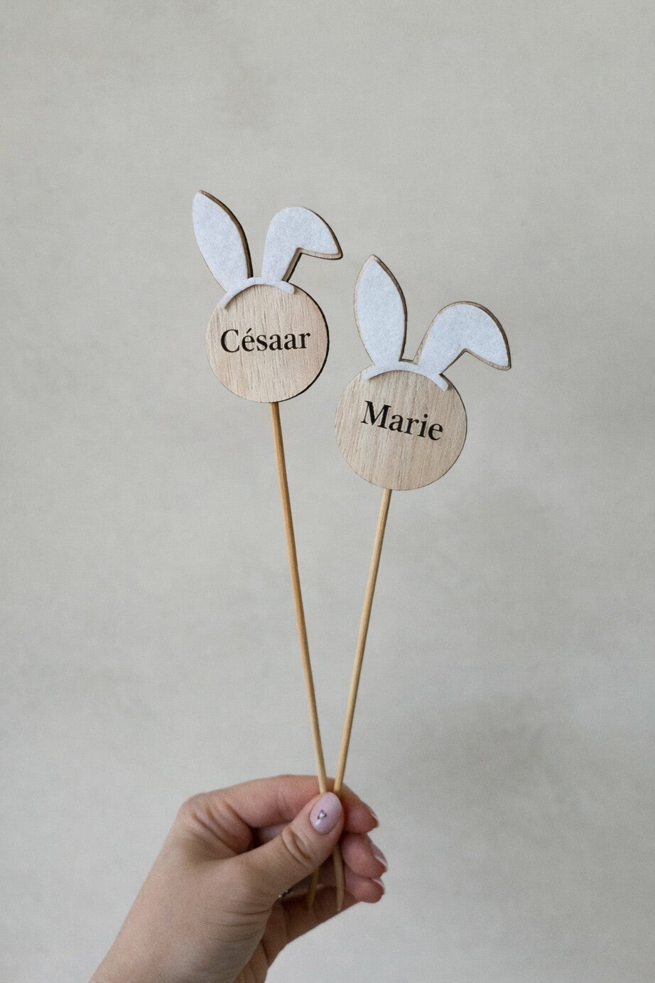 Maak Pasen extra leuk met deze gepersonaliseerde houten stokjes in de vorm van een konijntje (diameter cirkel 3,7 cm).