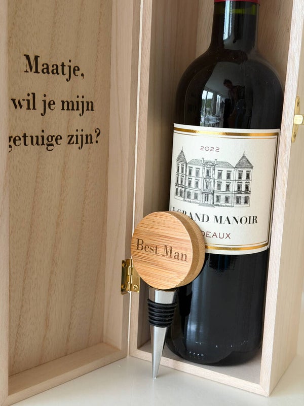 Vraag je getuige op een manier die zij of hij voor altijd zal koesteren. Deze wijnkist wordt gepersonaliseerd met een boodschap die recht uit het hart komt. Een subtiel, liefdevol en blijvend aandenken dat jullie bijzondere band extra in de verf zet.