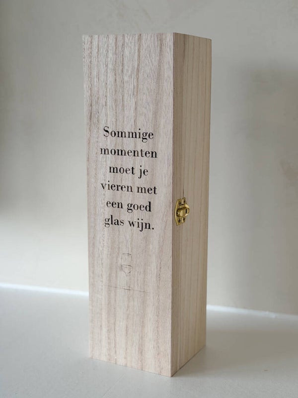 Met een formaat van L 36 CM x B 20 CM x H 10 CM biedt de kist ruimte voor één standaard wijnfles (niet inbegrepen), maar het échte cadeau zit in de details.