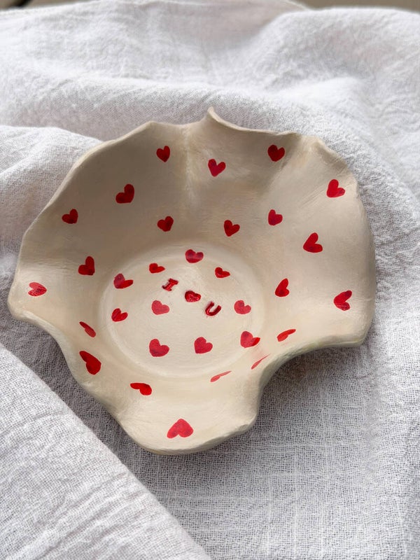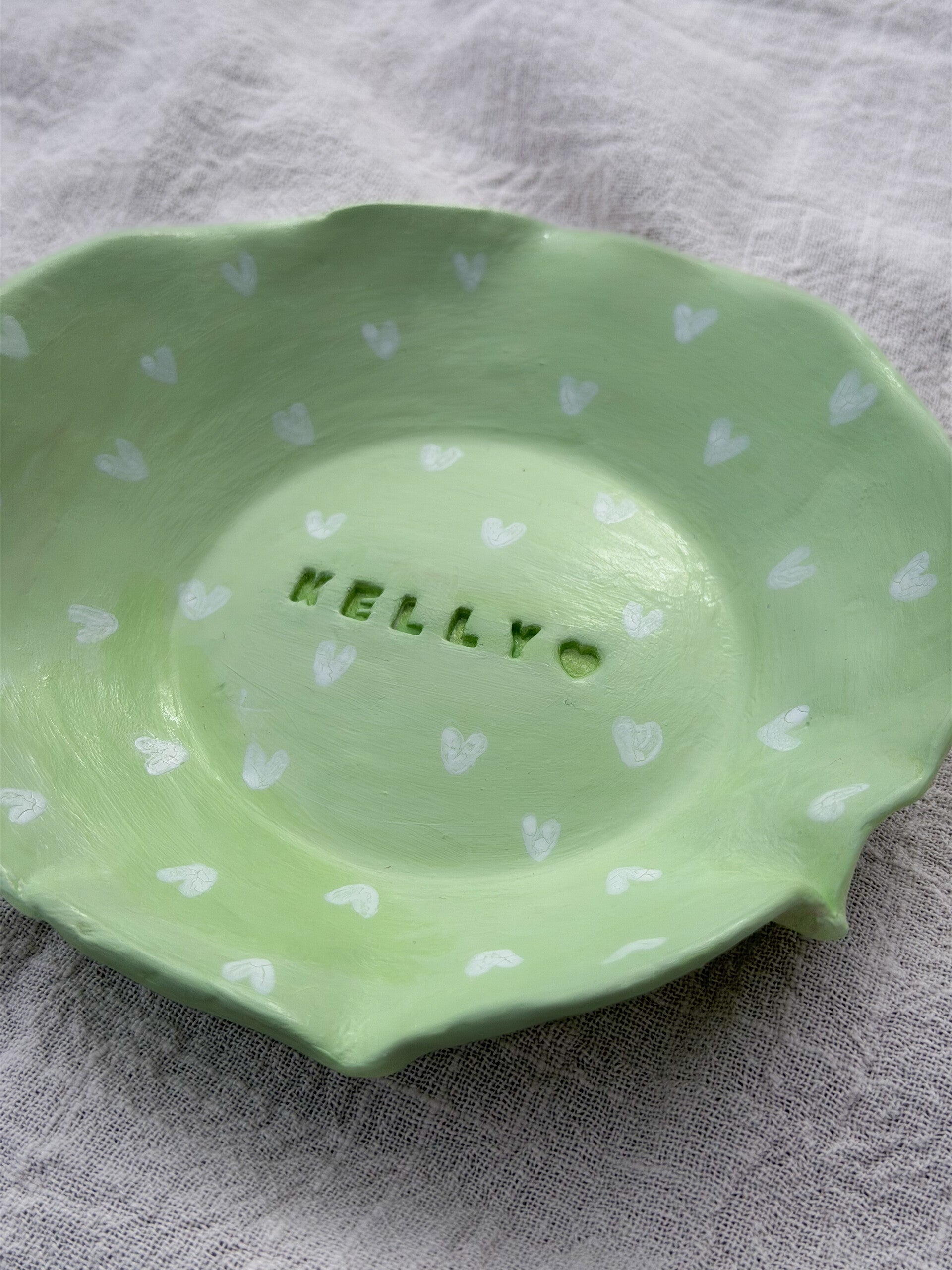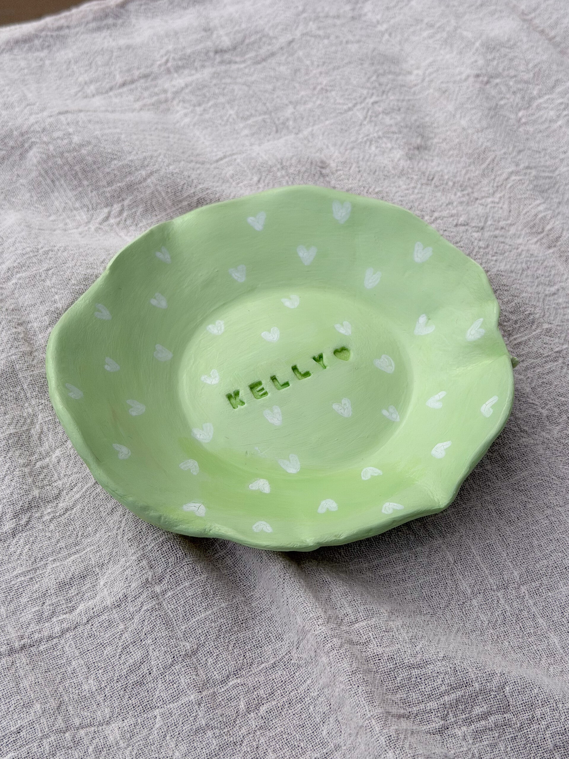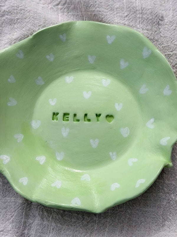 Dit unieke schaaltje wordt volledig met de hand gemaakt uit klei en is daardoor altijd uniek. Je kan jouw schaaltje volledig personaliseren. Kies zelf de kleur, het motief en de tekst die in het schaaltje wordt gedrukt. Zo creëer je een persoonlijk en uniek stuk dat perfect past als cadeautje of als detail in je interieur.