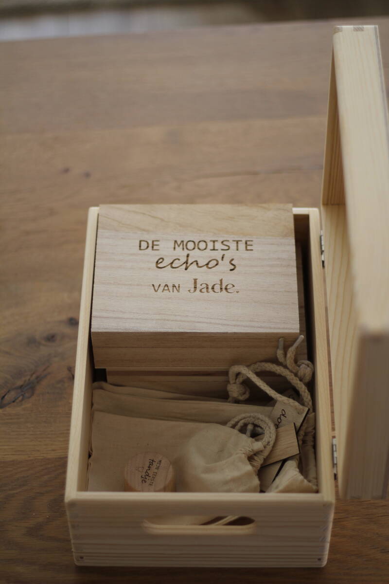 Echo-box: een apart houten doosje met opschrift (17cmx12cmx4cm) om alle echofoto’s veilig in op te bergen. Dit doosje kan je verder personaliseren naar wens op basis van het geboortekaartje .
